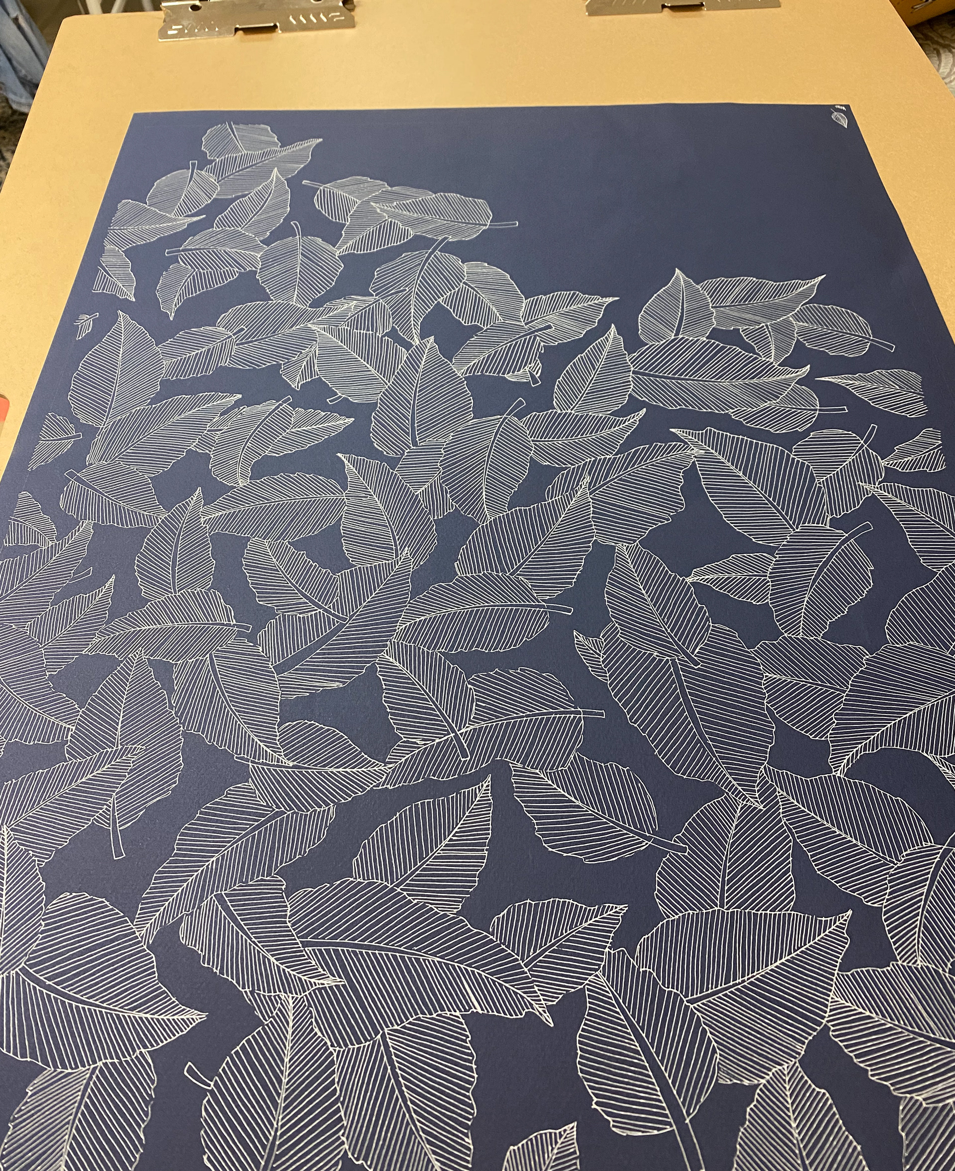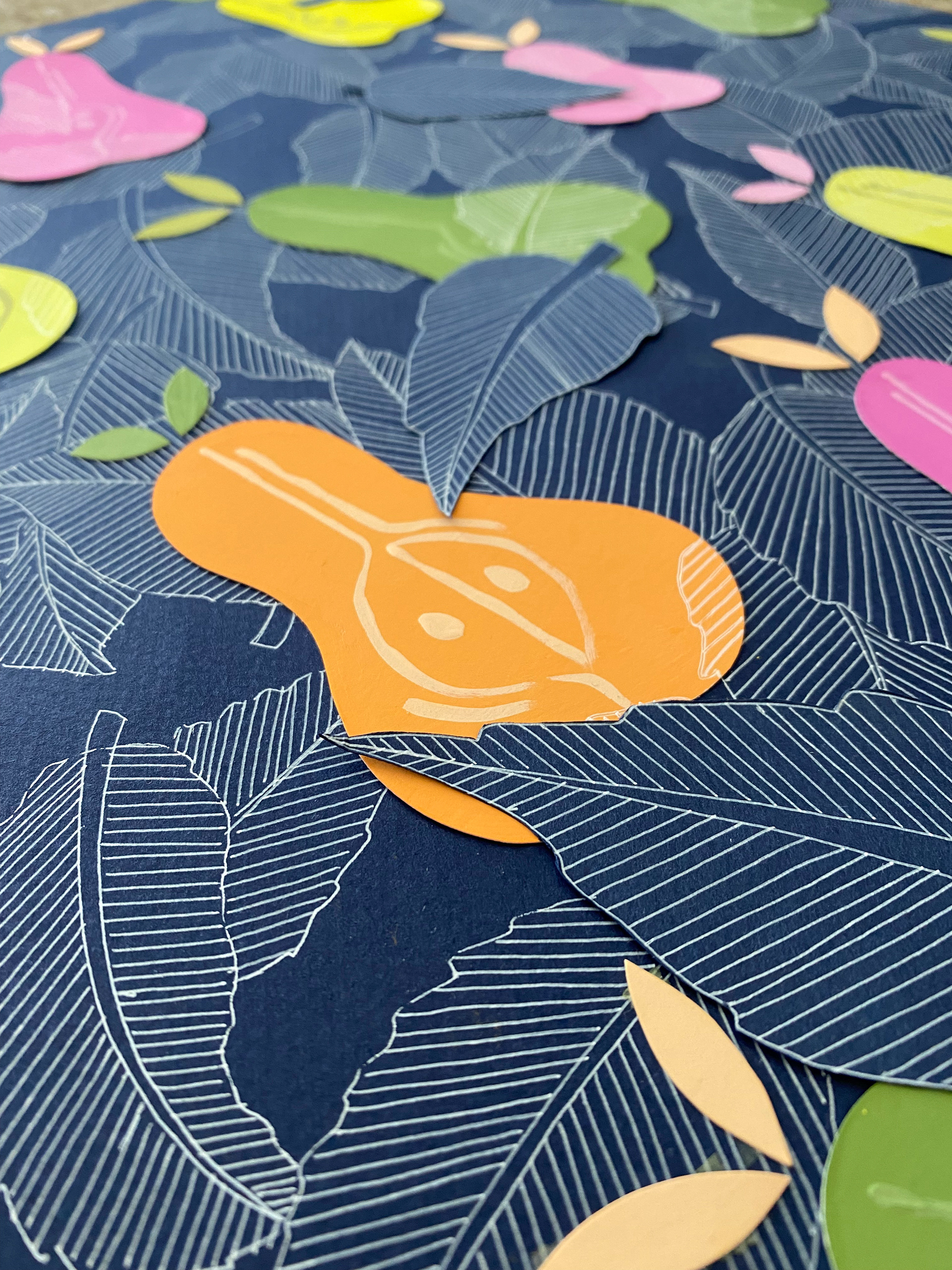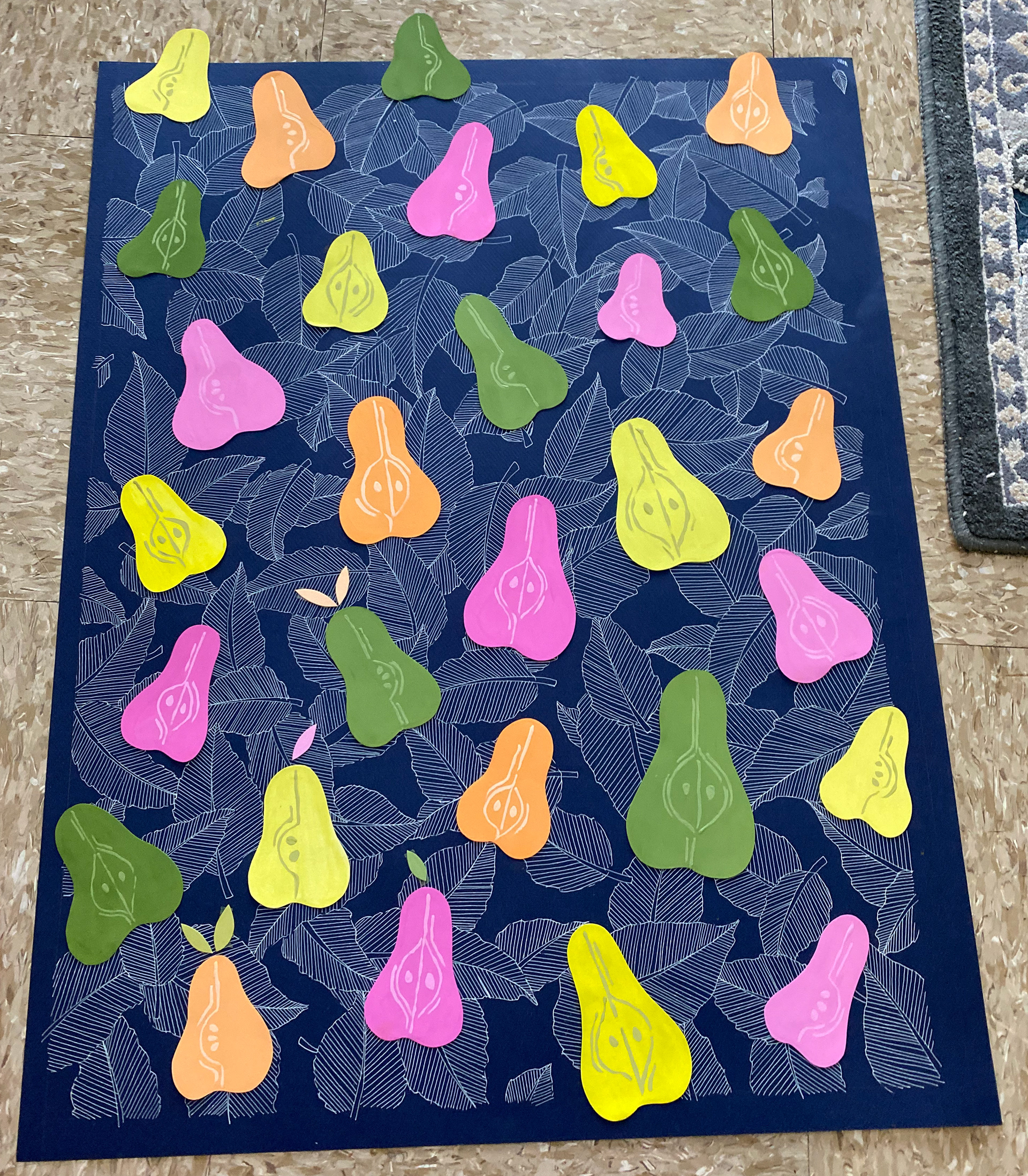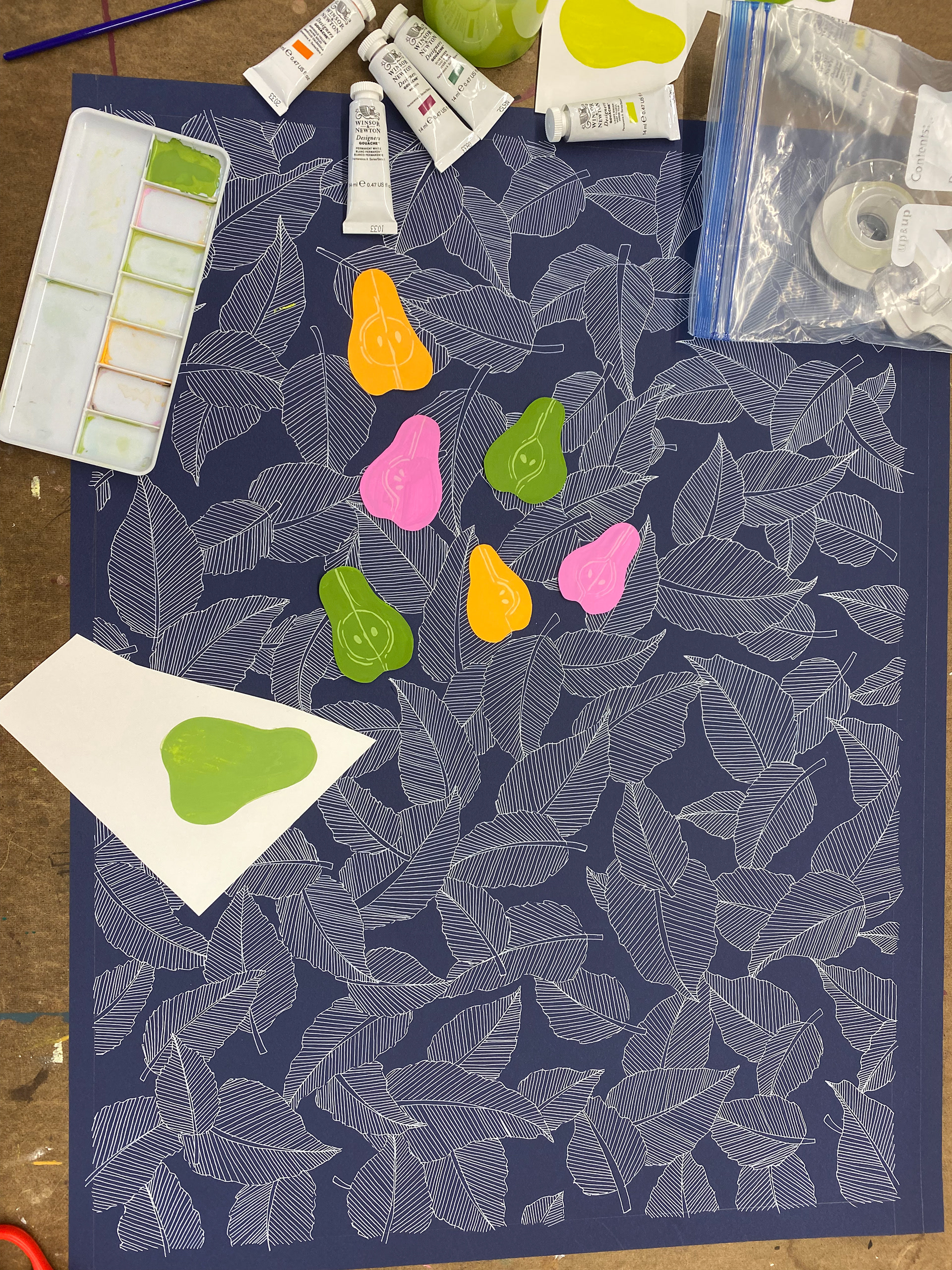 These gouache pears mounted on 18x24 inch drawing paper were created for a fibers course. The leaves were illustrated with white gel pen. Closeups and process shots included below!