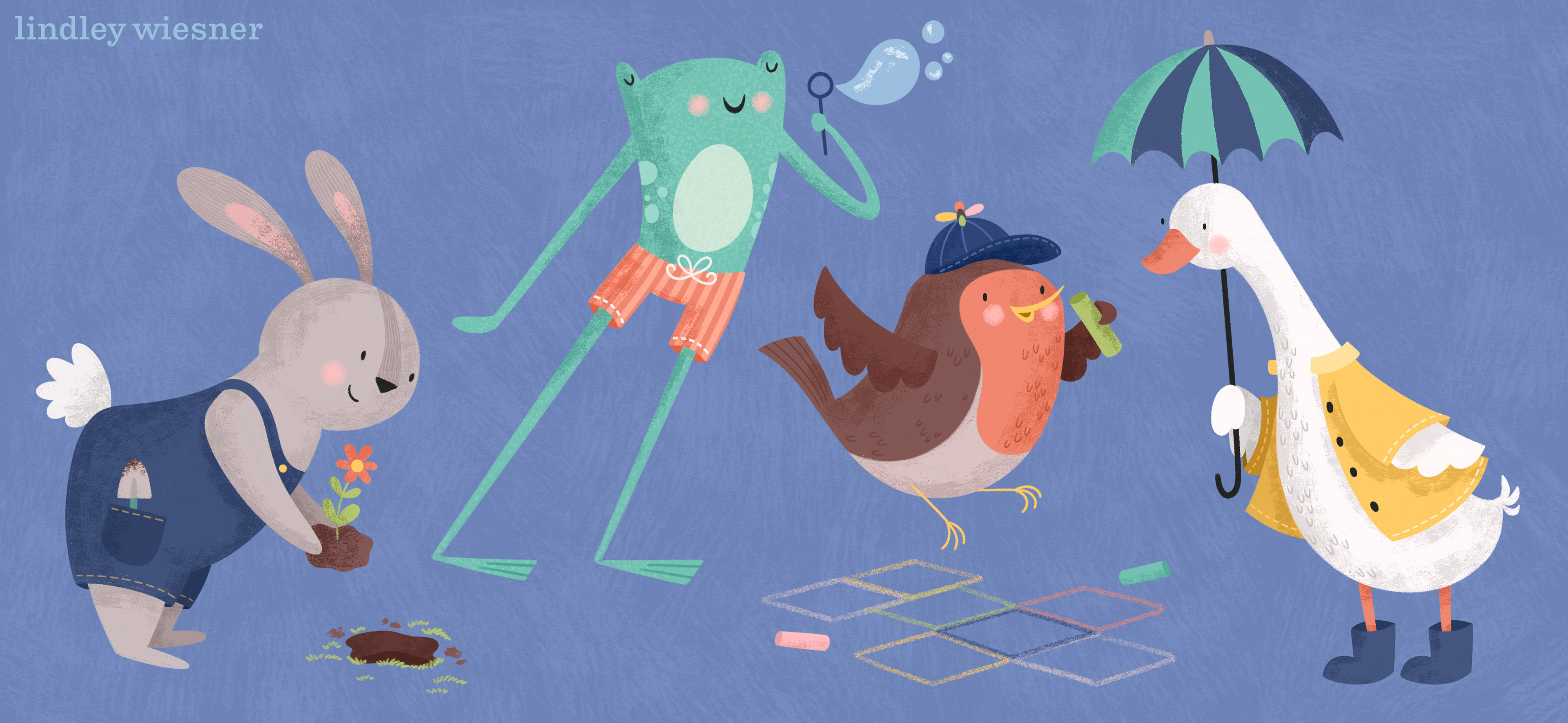 I created this lineup of anthropomorphic animals for my Contextual Character Design class at SCAD! I was inspired by my love of springtime animals and chose to have them engaging in springtime outdoor activities.