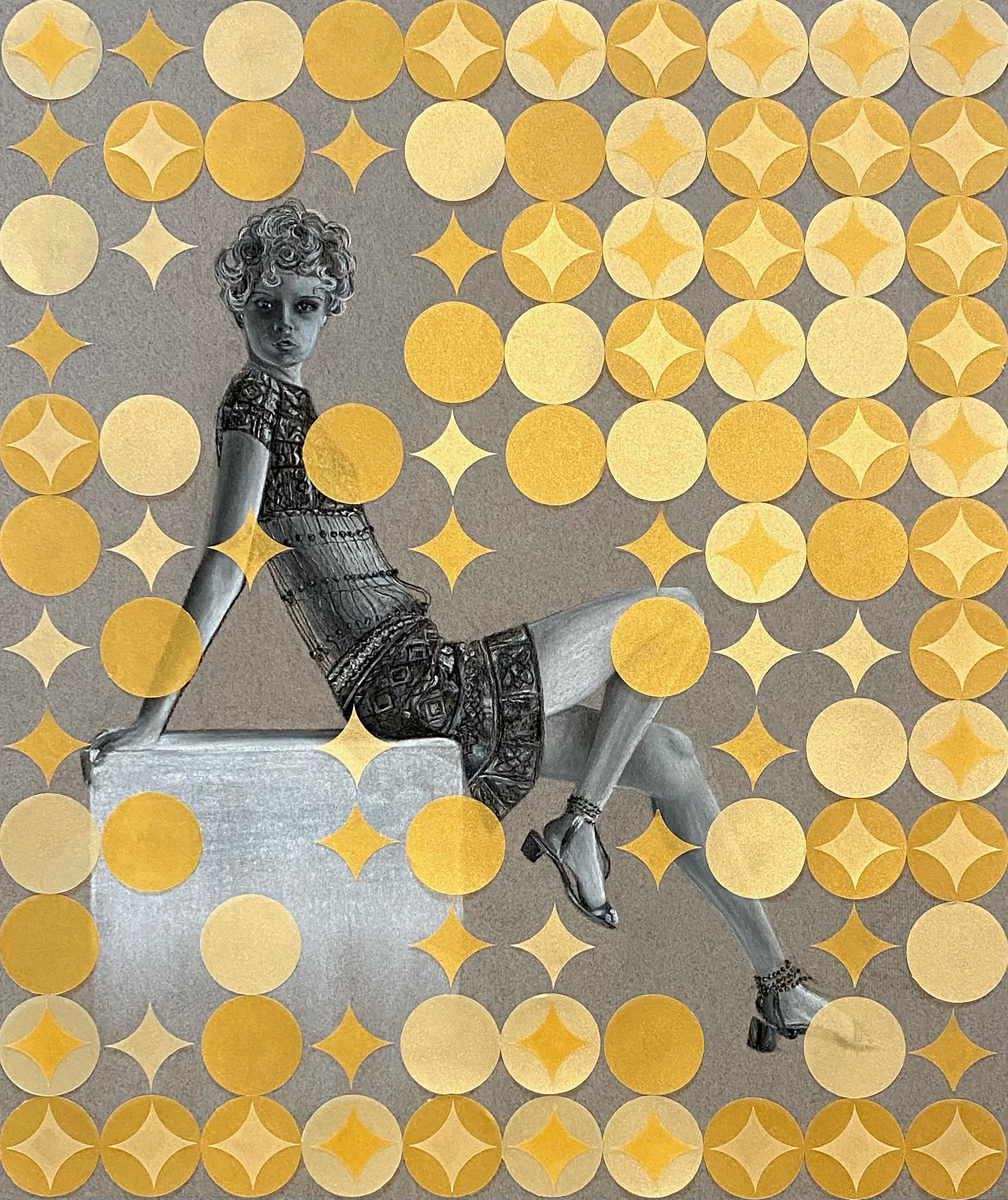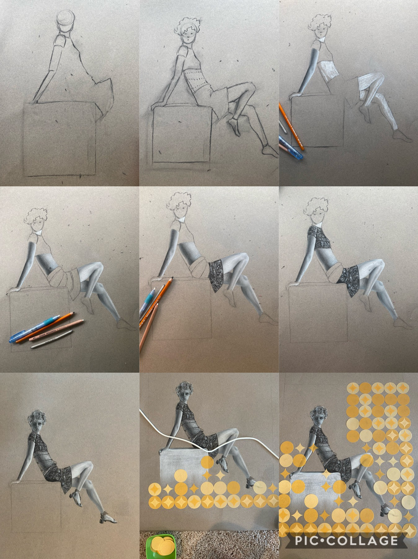 This black and white charcoal portrait was created for my Life Drawing course at SCAD. It was completed on toned paper and depicts the 1960s model Twiggy. It is overlaid with vellum circles and sparkles cut out using a Cricut Maker. Process shots included below!